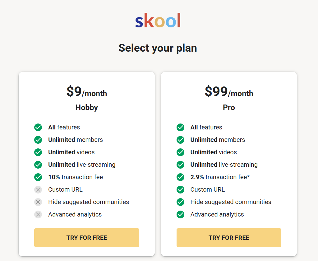 Skool 沒有免費方案,但有超低門檻的 $9 Happy Plan,非常適合初學者起步。